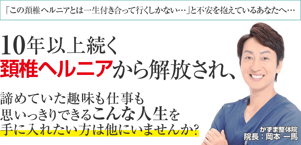 私は誰よりもあなたと向き合います。あなたのお悩みを私に聞かせてください。あなたの頚椎ヘルニアを改善する為に全力で施術を致します。本気で頚椎ヘルニアを改善したいと思われる方は今すぐお電話ください!