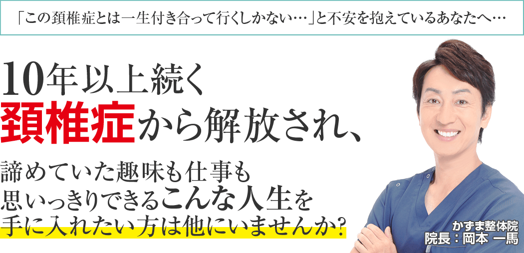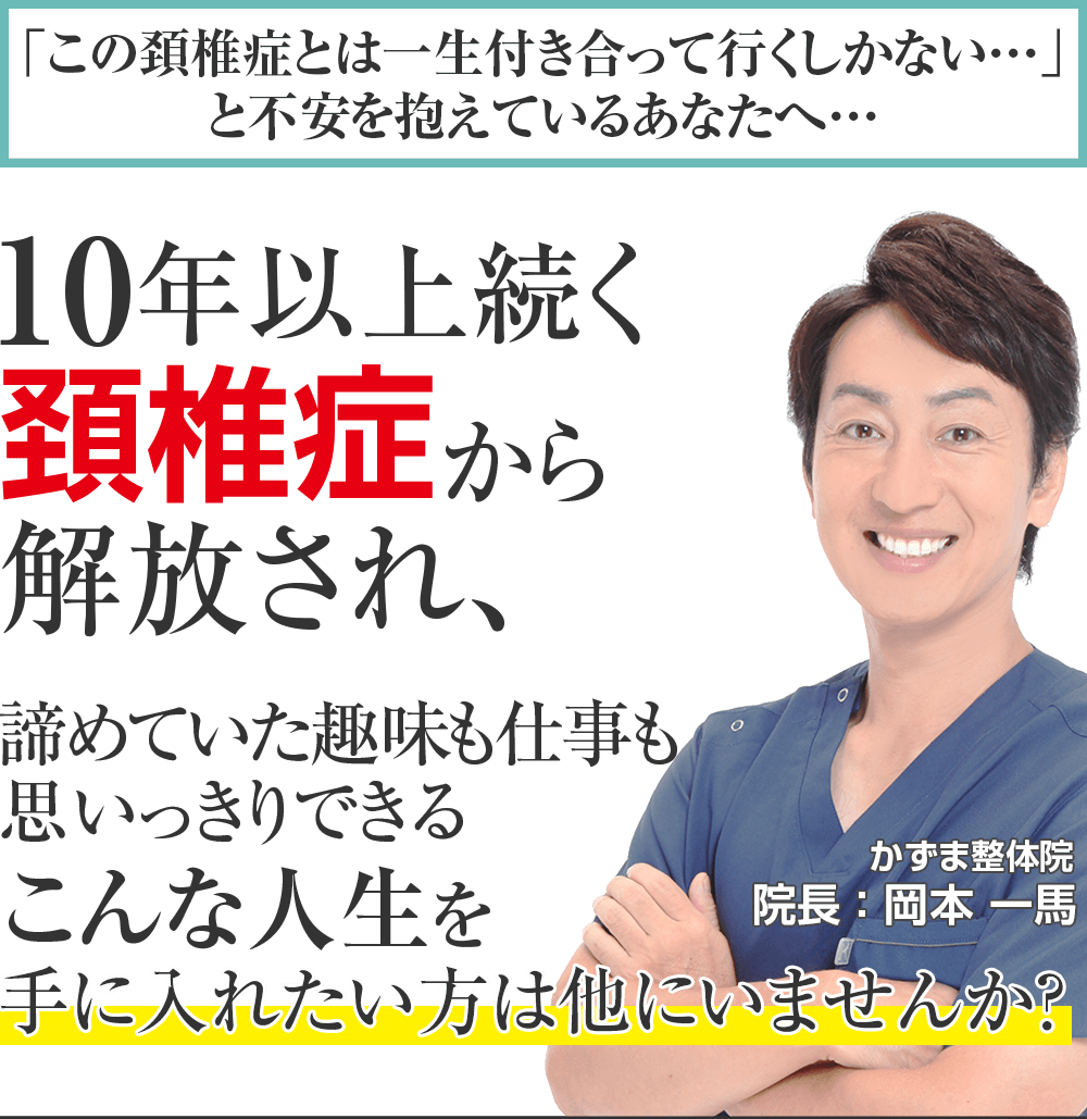 身体のプロとしての証である国家資格を持ち、治療院勤務や接骨院勤務で数多く頚椎症お客様から支持され、あなたの症状に真正面から向き合ってくれる一宮市で唯一の頚椎症専門整体院かずま整体院に、来院し、もう二度とその頚椎症を我慢することのない人生を手に入れる道。